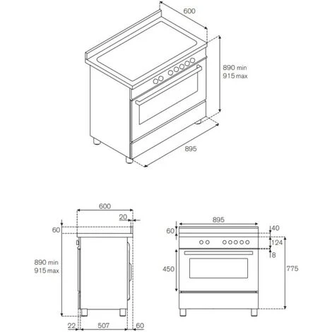Il modello è dotato di un piano cottura a gas con lato posteriore, un forno multifunzione con porta a soffietto, maniglia orizzontale e finestra di visualizzazione, un cassetto per la conservazione e un pannello di controllo con interruttori rotativi e un termometro analogico.