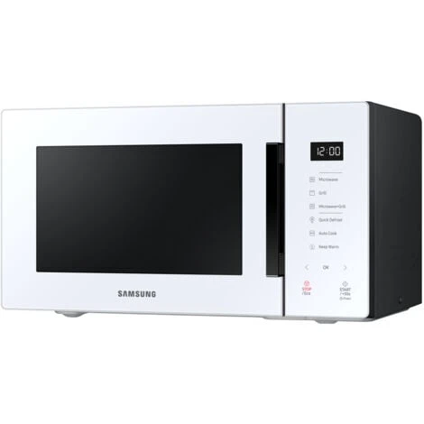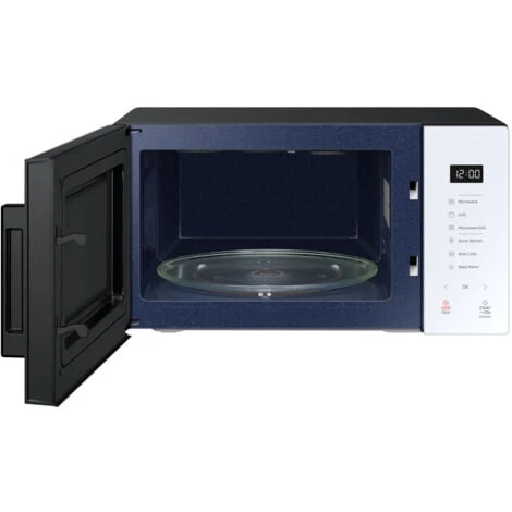 Samsung MG23T5018AW/ET. Posizionamento dell’apparecchio: Superficie piana Tipo di prodotto: Microonde con grill Capacità interna: 23 L. Carico di collegamento: 1250 W Tensione di ingresso AC: 230 V Frequenza di ingresso AC: 50 Hz. Larghezza: 489 mm Profondità: 381 mm Altezza: 275 mmIl complemento perfetto per la tua cucina Nuovo design & nuovi colori Scegli il microonde più adatto in base al tuo gusto personale e allo stile della tua cucina. Oltre che con un nuovo design questa linea è disponibile in un’ampia gamma di colori: Carbone Grafite Porcellana Neve Cipria Pietra. Scongelamento rapido Quick Defrost Scongela rapidamente i congelati con la funzione Quick Defrost (scongelamento rapido) che presenta opzioni per i 5 alimenti più comuni: carne pollame pesce verdura e pane. Basta selezionare la tipologia di alimento e il peso e il forno calcola automaticamente il tempo di scongelamento ottimale. In questo modo la preparazione degli ingredienti diventa più rapida preservando le sostanze nutritive. Un tocco di stile Glass Touch & Simple UX Prova un modo intuitivo ed elegante di cucinare. Il pannello di controllo Glass Touch presenta solo i 6 pulsanti essenziali azionabili con un semplice tocco. Inoltre essendo in vetro si integra perfettamente con il frontale del forno e la porta creando un elegante look minimalista. Interno facile da pulire CERAMIC INSIDE™ La pulizia dopo l’utilizzo diventa più semplice. La superficie interna liscia CERAMIC INSIDE™ si pulisce senza strofinare e non scolorisce nel tempo. L’istituto di ricerca tedesco Hohenstein ha riconosciuto a questa superficie un’efficacia antibatterica pari al 99 9%. Si tratta di una superficie robusta 7 volte più resistente a graffi e ruggine rispetto ad altri rivestimenti interni. Migliora i tuoi risultati in cucina Triplo Sistema di Distribuzione Assicurati che tutte le tue pietanze siano deliziose e cotte alla perfezione. L’esclusivo Triplo Sistema di Distribuzione diffonde le microonde in 3 direzioni affinché raggiungano ogni punto e attraversino gli alimenti da più direzioni. Questa funzione garantisce una cottura molto più accurata e uniforme. Cucina con precisione Auto Cook Prepara piatti deliziosi senza ricette e senza improvvisare. Auto Cook offre varie opzioni per le pietanze preparate con maggior frequenza come pasta e pollame. Ognuna di queste opzioni è pre-programmata con la modalità il tempo e la temperatura ottimali. Per una cottura perfetta basta selezionare la tipologia di alimento e il relativo peso. Risparmia energia in standby Modalità ECO Prepara pietanze deliziose senza trascurare l’ambiente. La modalità ECO riduce sensibilmente il consumo energetico in standby portandolo al livello più basso del settore. Mentre non stai cucinando il forno mantiene al minimo l’energia necessaria per alimentare le funzioni essenziali. Così mentre risparmi aiuti a proteggere l’ambiente.