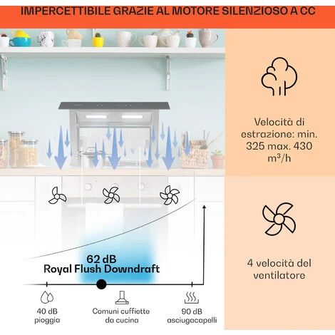 ASPIRAZIONE ORIZZONTALE: Installa la cappa aspirante Downdraft su un banco o su un’isola da cucina e alzala verso l’alto quando è il momento di cucinare. A differenza di una normale cappa aspirante, questa cappa cucina aspira in maniera orizzontale.