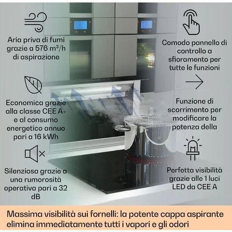 VENTOLA SILENZIOSA: Grazie alla potente portata d’aria di 576 m³/h e 10 velocità, la nostra cappa aspirante 60cm non solo filtra i fumi e riduce gli odori, ma lo fa in modo silenzioso così da permetterti di cucinare e conversare senza interruzioni.
