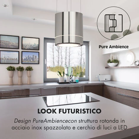 PER LA TUA CUCINA A ISOLA: Sblocca il potenziale della tua cucina con questa cappa aspirante per cucina a isola. Grazie all’illuminazione LED per illuminare i tuoi cibi in cottura, è la cappa isola migliore per eliminare fumo e odori in cucina.
