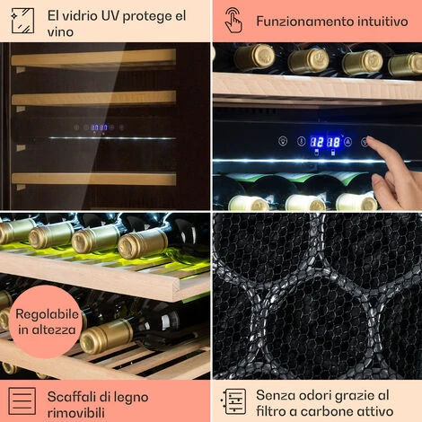 CON CONTROLLI TOUCH: I controlli touch della cantina vino Klarstein, ti consentono di impostare una temperatura costante per la freschezza e la qualità dei tuoi vini. Il display LCD mostra la temperatura interna per il controllo di ogni vino.