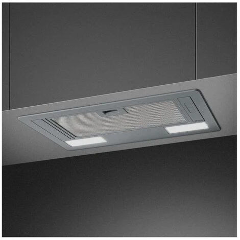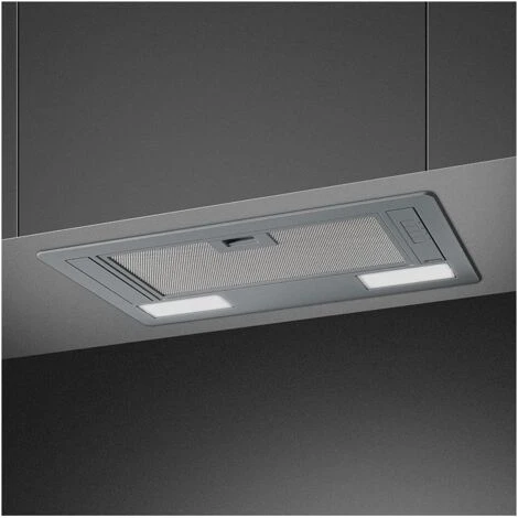 Smeg KSG52HE. Potenza massima di estrazione: 368 mⁿ/h, Classe di efficienza dinamica del fluido: E, Classe di efficienza luminosa: D. Tipo: Integrato, Colore del prodotto: Argento, Potenza lampadina: 3 W. Tipo di filtro antigrasso: Alluminio, Numero di filtri: 1 pz. Classe efficienza energetica: D, Consumo energetico annuo: 71 kWh, Carico di collegamento: 146 W. Larghezza: 534 mm, Profondità: 300 mm, Altezza: 208 mm
